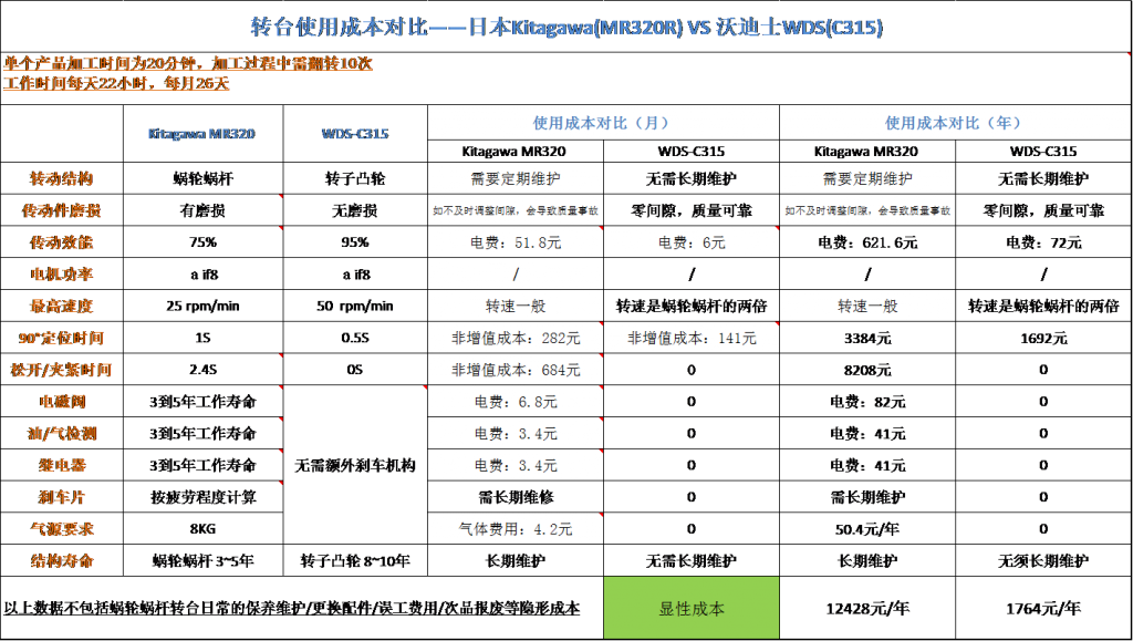 汽車配件行業(yè)一位客戶在試用沃迪士WDS-C315型號時將沃迪士第四軸產(chǎn)品與其原有的日本北川Kitagawa MR320R型號性能進行了跟蹤和記錄,測試詳細結(jié)果如下表。沃迪士數(shù)控回轉(zhuǎn)臺以其獨特的滾子凸輪結(jié)構(gòu)在轉(zhuǎn)速、傳動效率和維護成本上展現(xiàn)了明顯的優(yōu)勢。