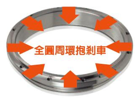 環(huán)抱式剎車環(huán)安裝在出力軸上,通過液壓壓力使剎車面變形,接觸面積大。